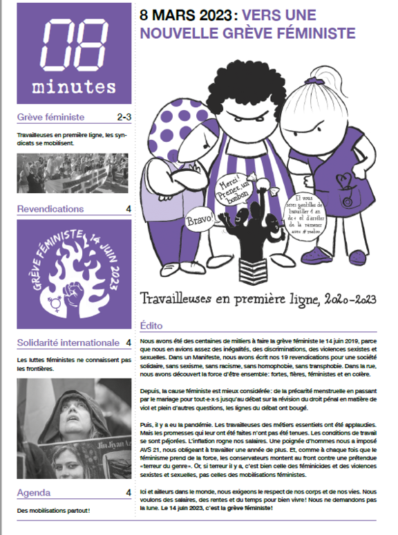 A l’occasion de la journée internationale des droits des femmes, l’Union syndicale vaudoise lance sa campagne de mobilisation pour la grève féministe 2023 qui se tiendra dans tout le canton. L’appel est lancé au travers de l’édition 2023 du journal 8 minutes qui est distribué ce jour sur les lieux de travail par l’ensemble des fédérations membres de l’Union syndicale vaudoise.