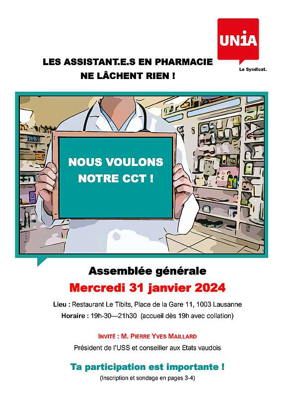 Le comité Unia des assistant-e-s en pharmacies vaudoises a pris connaissance par communiqué de presse de la décision de la SVPh de « ne pas entrer en matière sur la demande d’ouverture de négociations pour une CCT » pour la branche des pharmacies. Une assemblée générale est convoquée le 31 janvier 2024 pour décider de la suite à donner à ce refus et des mesures à prendre. Le Président de l’Union syndicale suisse Pierre-Yves Maillard est invité à cette occasion.