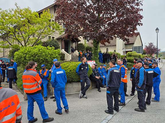 Des travailleurs-ses convaincu-e-s et mobilisés Pour accueillir leur direction ce jour sur le site de Vetropack, les salarié-e-s se sont mobilisés pour faire une haie d’honneur revendicatrice. Ils se rendront demain à Lausanne pour relayer leur lutte dans le cadre des mobilisations du 1er mai vaudois et iront déposer copie de leur rapport jeudi à Bülach auprès du Président du Conseil d’administration Claude Cornaz puisque celui-ci n’a pas daigné se déplacer pour entendre les propositions solides et étayées des salarié-e-s. En tant qu’actionnaire à plus de 70% de Vetropack, c’est non seulement l’avenir du site qui est entre ses mains, mais aussi la filière verre de proximité la plus écologique d’Europe qui est en jeu.