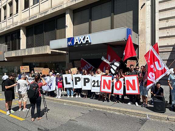 Les rentes du 2ème pilier sont déjà en baisse depuis des années. Avec la réforme, elles diminueraient encore, ce qui n’est ni juste ni nécessaire. Alors que le lobby des banques et des assurances a su convaincre le Parlement de passer en force avec cette nouvelle réforme de la LPP, notre coalition progressiste veut faire primer la solidarité et le maintien d’assurances sociales fortes. Les erreurs de calcul de l’administration fédérale ont déjà induit les citoyen-ne-s en erreur lors du vote sur AVS 21. Que cet objet repasse devant le peuple ou non, le fait est que les promesses faites lors de la votation sur AVS21 d’améliorer la situation des femmes dans la LPP ne se concrétisent pas. Au contraire, cette nouvelle réforme annonce des hausses des cotisations et des baisses de prestations, principalement pour elles. Un rejet massif le 22 septembre est nécessaire.Stop aux abus du secteur financier et des assurances La gestion du 2e pilier nous revient cher. La caisse de pensions coûte à chacun de nous, en frais administratifs, plus de 1 400 francs par an. C’est une aubaine pour l’industrie financière, qui gagne toujours plus avec les caisses de pensions. À elle seule, la gestion de fortune engloutit plus de 6 milliards de francs par an. Même les experts en conviennent : c’est trop cher. Le potentiel d’économies est donc gigantesque ! Pour cette raison, l’action de lancement s’est déroulée devant le siège d’une assurance particulièrement agressive sur le marché du 2ème pilier, AXA Winterthur. C’est ce secteur financier qui a mis en échec le compromis entre partenaires sociaux pour un 2ème pilier plus durable et plus solidaire et poussé le Parlement à une contre-réforme antisociale.