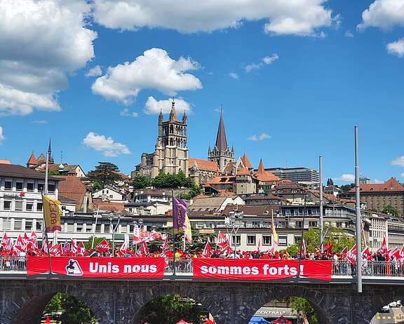Cet après-midi, plus de 10’000 maçons ont manifesté à Zurich et à Lausanne pour faire entendre leurs revendications concernant la nouvelle convention nationale de manière forte et combative. A Lausanne, des banderoles ont été étendues sur les ponts de Lausanne pour afficher les revendications des travailleurs de la construction.