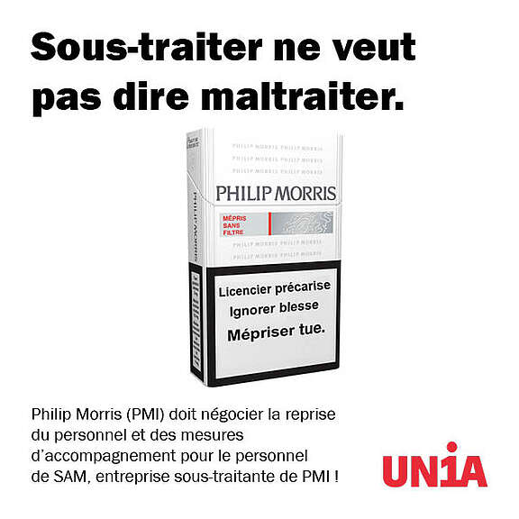 Le syndicat dénonce avec force la situation inacceptable vécue par les travailleurs de l’entreprise SAM Sensory and Marketing (société du groupe international Eurofins), sous-traitant de Philip Morris depuis 11 ans. Ces 80 salarié·e·s sont engagés pour tester, dans des conditions contrôlées, le goût des produits de Philip Morris (cigarettes, produits du tabac chauffé, etc.). Cet emploi qui nécessite capacités gustatives, concentration et suivi d’entraînements, est exercé, en raison de sa particularité, à un très faible taux d’activité. Même précaire, il permet à des personnes souvent en situation financière fragile - personnes au chômage, à l’AI ou à l’aide sociale — d’être dans la vie active et de générer un revenu qui est en partie déduit des aides touchées. Ces personnes montrent ainsi leur volonté de se prendre en charge.
